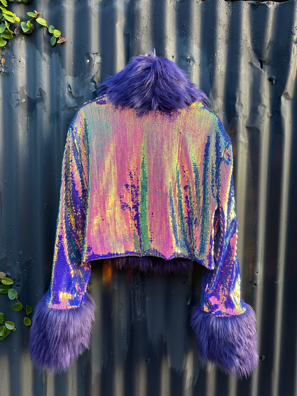 Add some wow factor to your wardrobe with the Purple People Eater Crop! This unique cropped coat features stunning purple sequins that shimmer with the colors of the rainbow, and a lush faux fur trim in a deep eggplant purple. With a stretchy fit that moves with your body and a fun UV reactive butterfly lining, this coat is the perfect addition to any festival or everyday look.